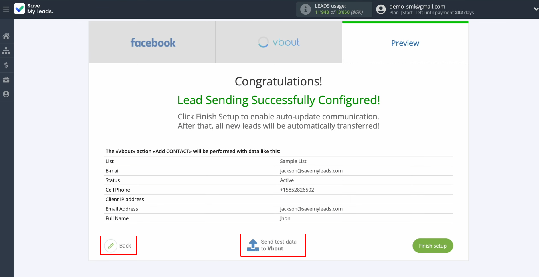 At this point, you see an example of the data that will be sent to Vbout as new contacts for each new lead from Facebook. If you want to correct something, click "Back" and you will take one step back. To check if you have configured everything correctly, click "Send test data to Vbout".