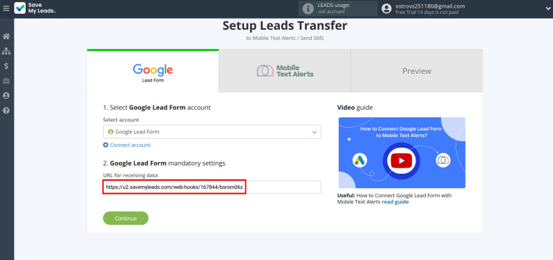 group. After that, click “Continue.” That's all. The Mobile Text Alerts + Google Ads Lead Form integration has been completed.