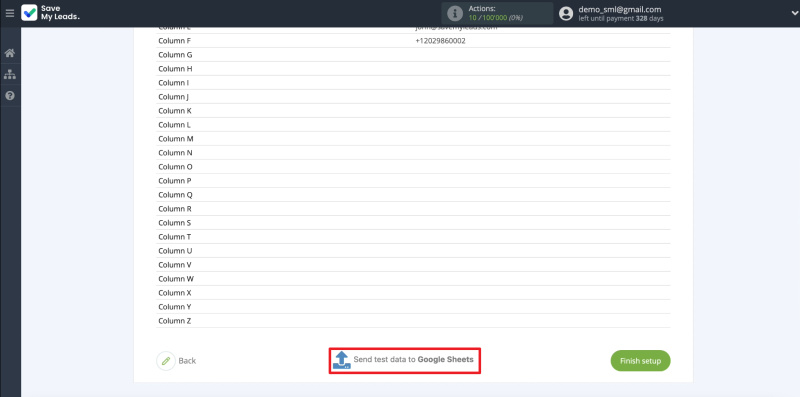 Now let's test sending this data to Google Sheets. To do this, just click Send test data to Google Sheets.