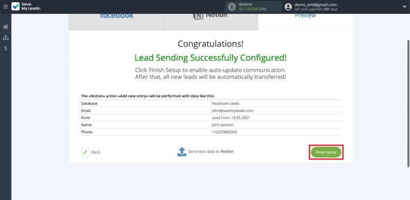 Now, as a test, we send the current lead to Notion using the Send test data to Notion button.
