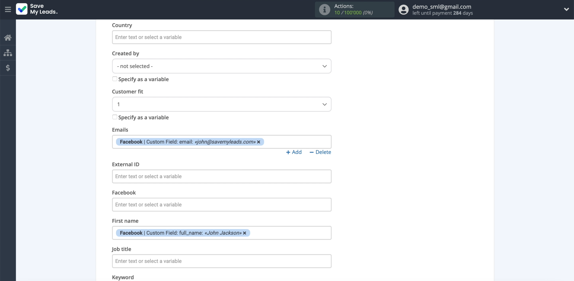 For example, in order for SaveMyLeads to copy from each lead, mail, name and phone number of the client, fill in the fields “Emails”, “First name” and “Mobile”. Leave the extra fields blank.