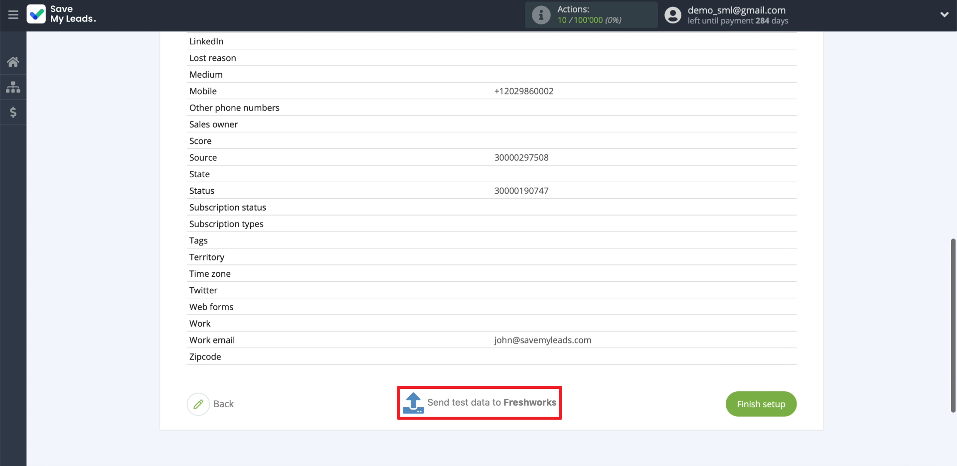 Let's use this lead to test uploading data to CRM. To do this, click "Send test data to Freshworks".