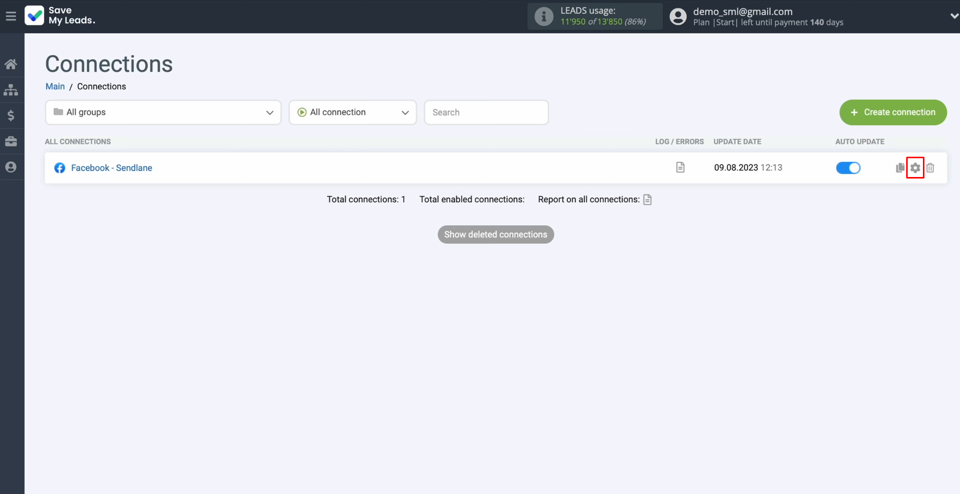 To set up Facebook integration with Sendlane, first, you have to create a new connection. For this, click on the button "Create connection".
