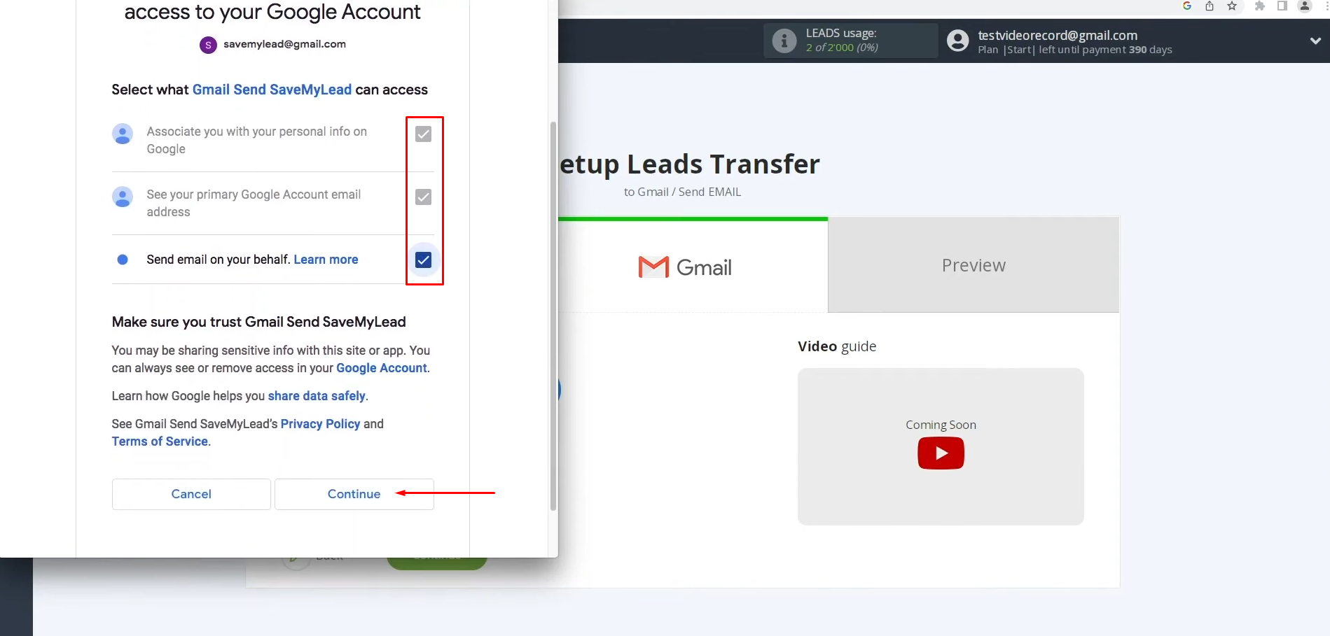 Give SaveMyLeads permission to work with your account by checking all the required boxes. Click “Continue”.