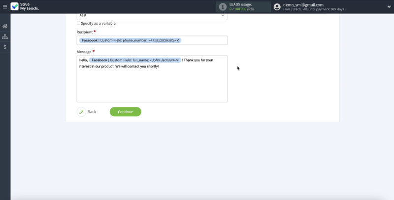 In the Message field, you need to compose the text of the SMS message that all new leads from Facebook will receive. If necessary, you can not only use variables, but also prescribe values yourself.