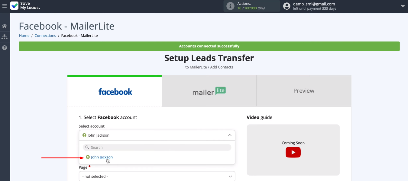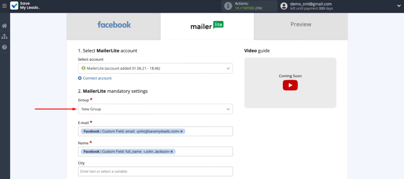Now we need to configure the receiver - the MailerLite service. We connect the MailerLite account to the SaveMyLeads system.