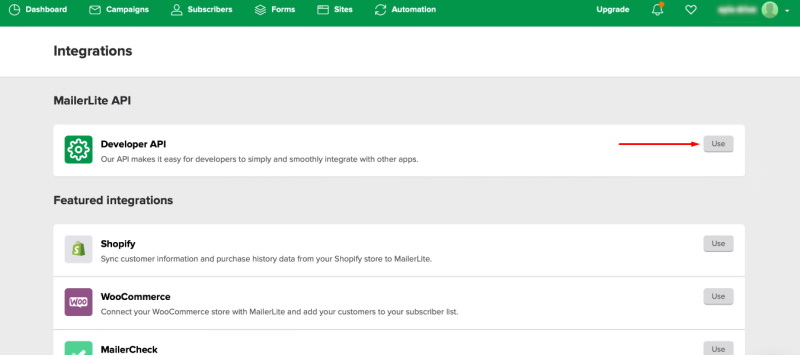 Go to your personal MailerLite account. We are interested in the “Integrations” section.