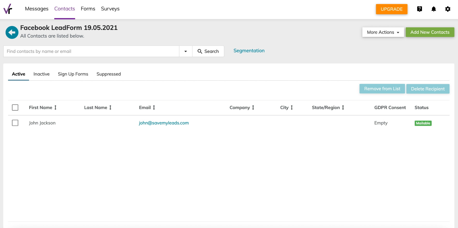 If everything is configured correctly, the uploaded lead will appear on the VerticalResponse mailing list.