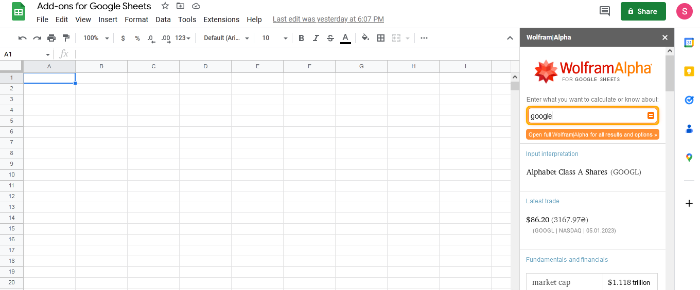 Wolfram Alpha for Google Sheets