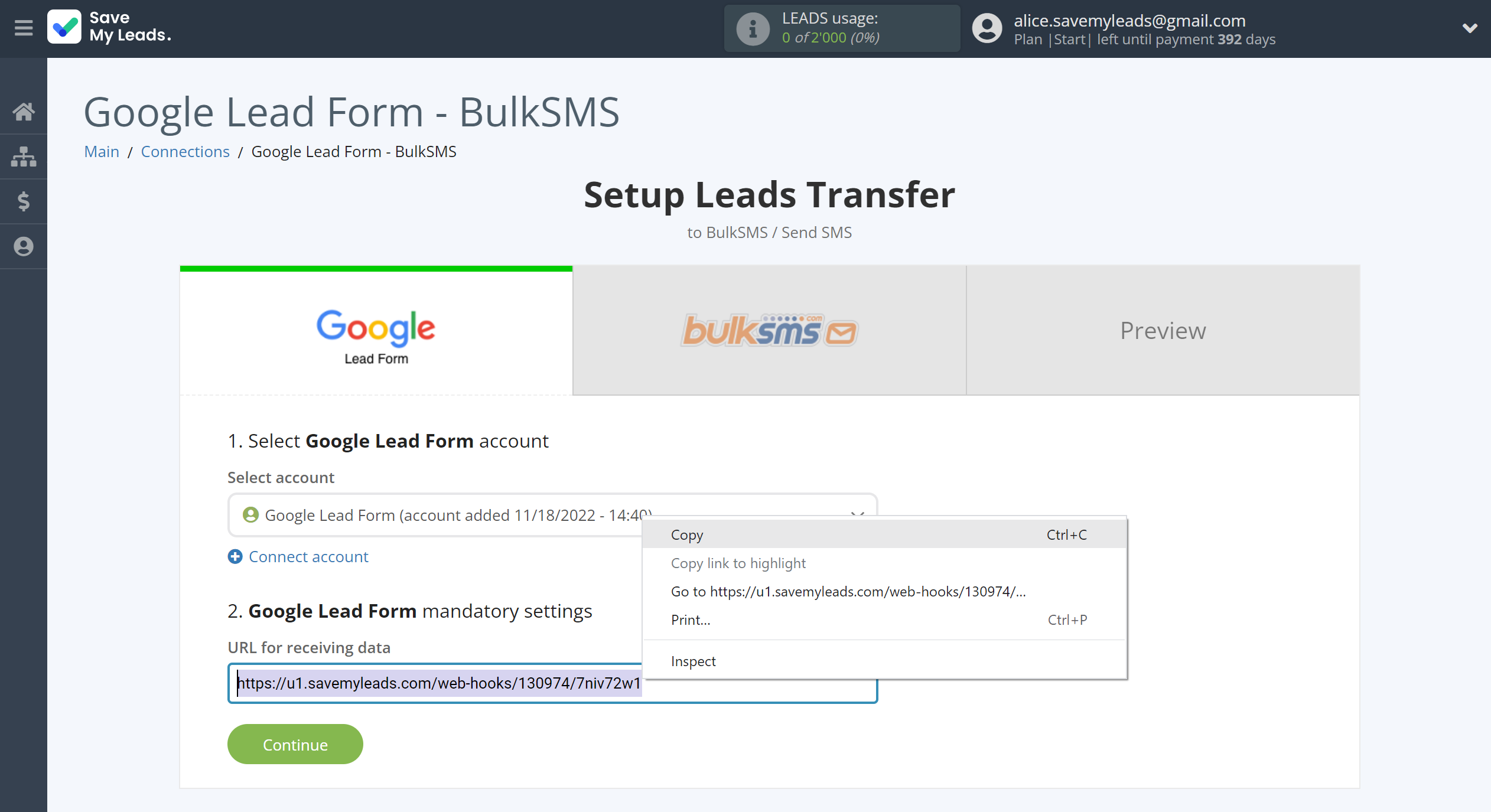 Next, you need to copy the "URL for receiving data", click "Continue" and go to your Google Lead Form account.