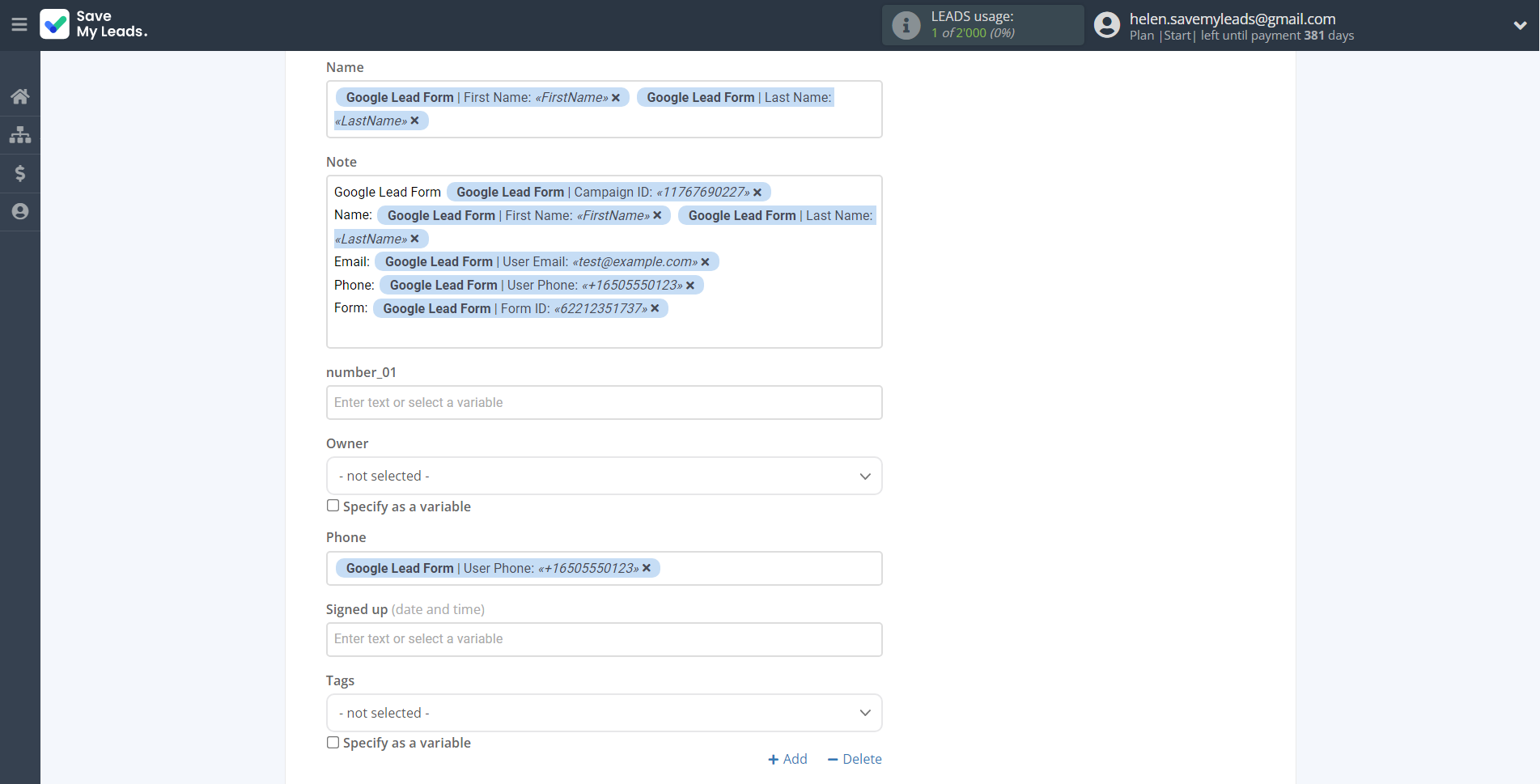 Select the required Google Lead Form data, click on the parameter and it will be assigned to the selected Intercom field.