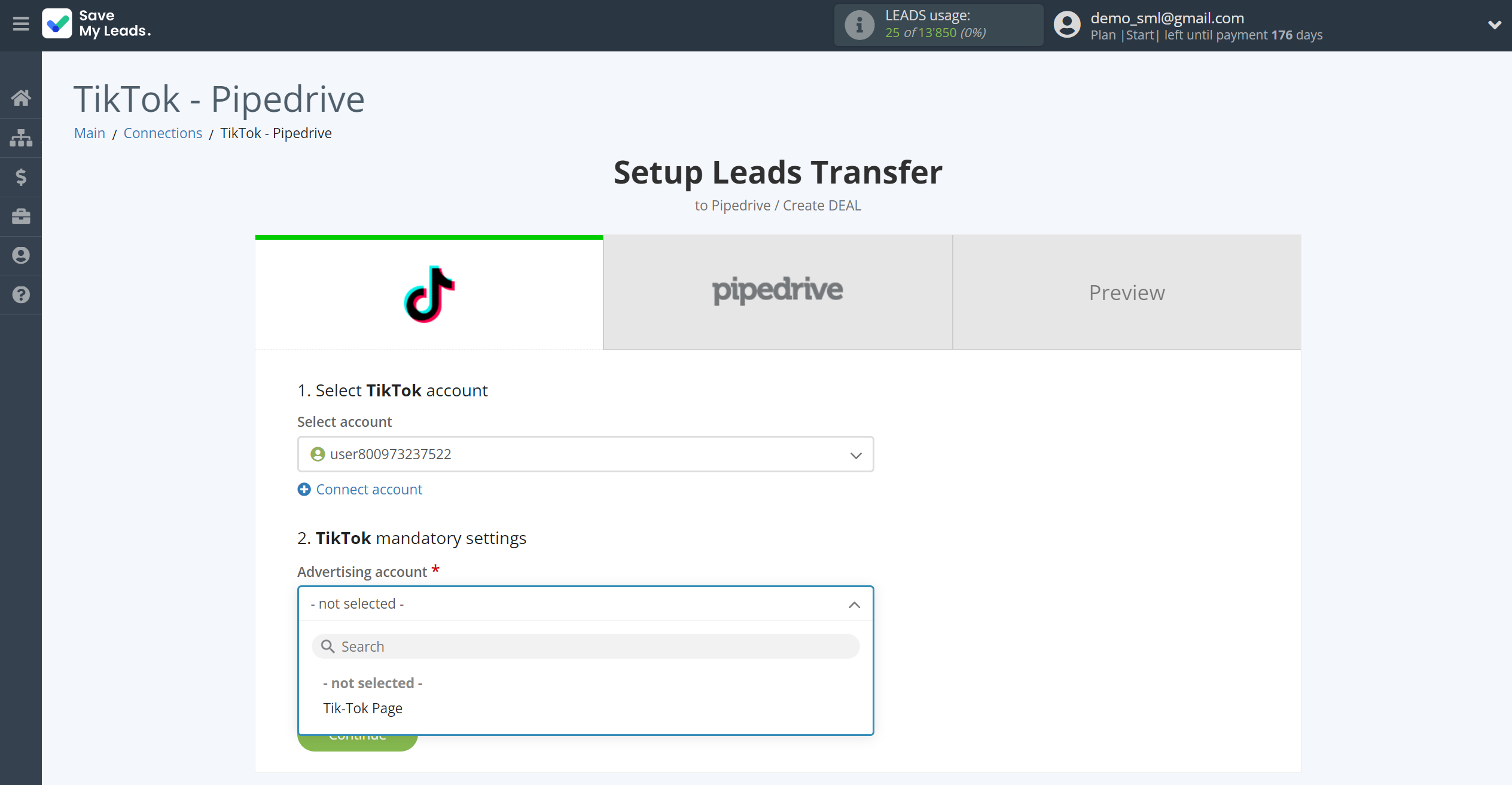 The next step is to select TikTok account from which SaveMyLeads get leads.