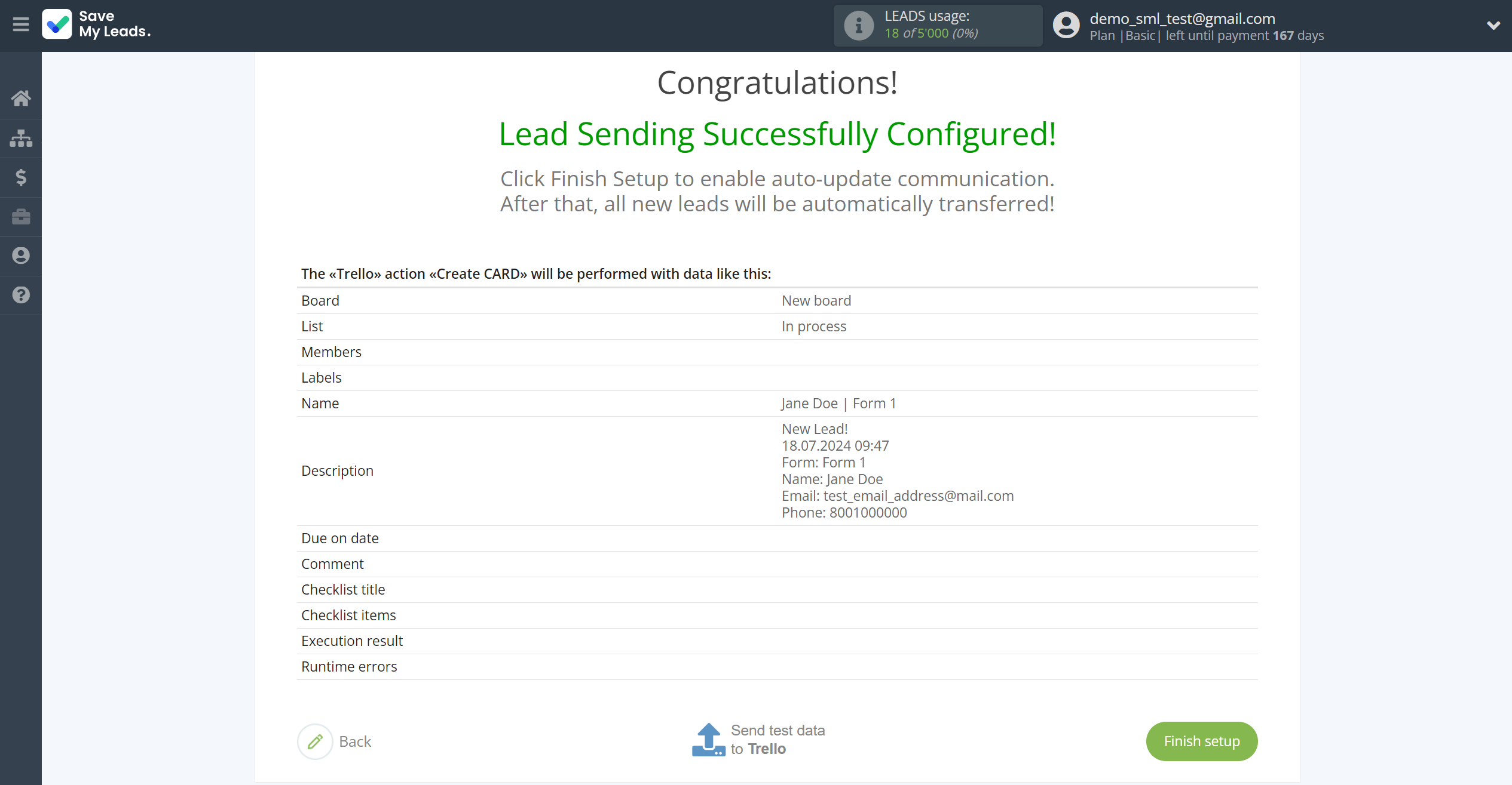 Click "Send test data to Trello" and go to the Trello cabinet in the appropriate group to test the connection.