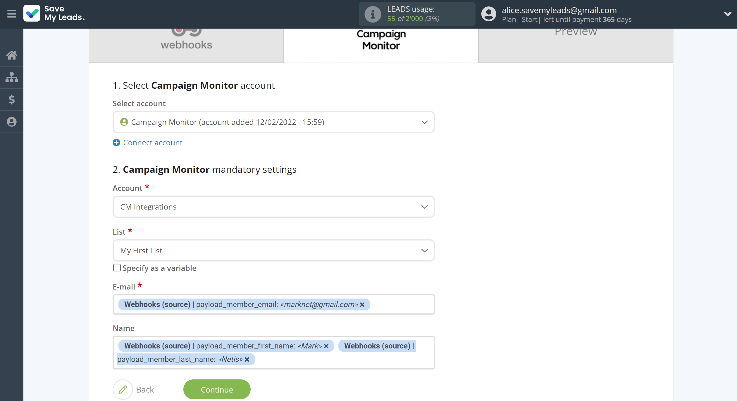 First you need to choose Account and List Campaign Monitor, to which SaveMyLeads will send lead data.
