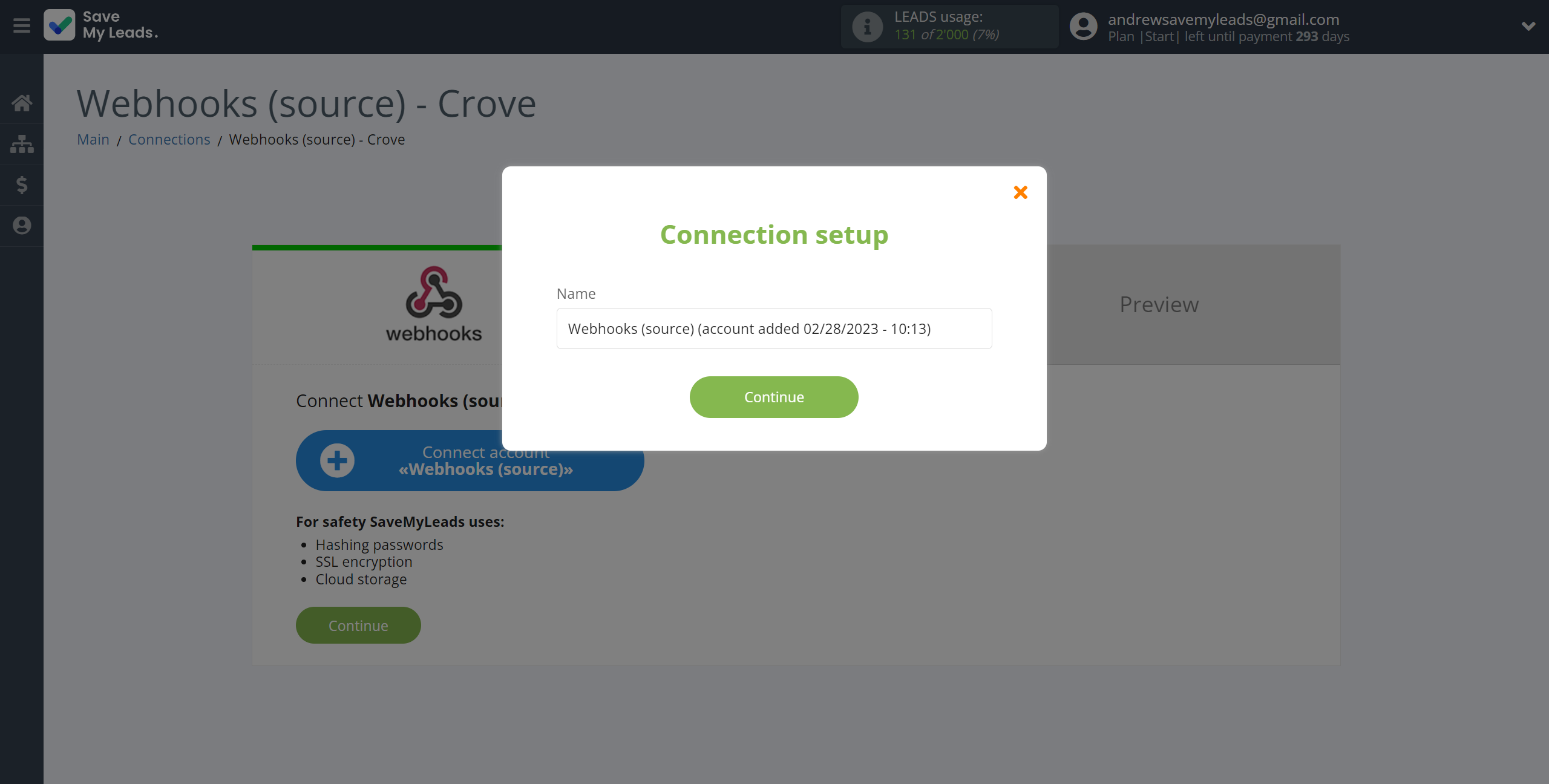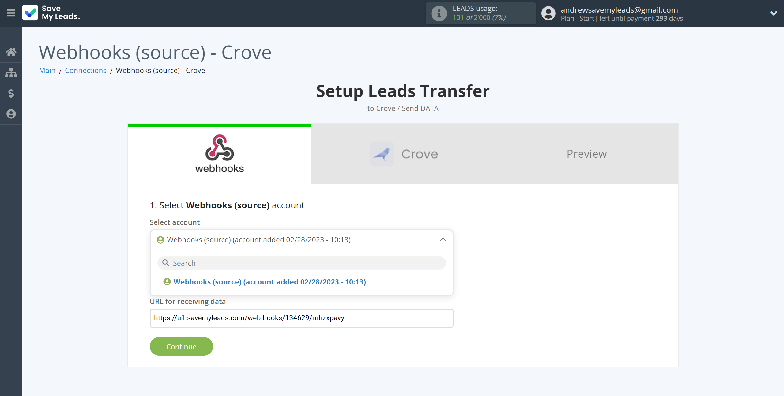 Next, you need to copy the "URL for receiving data", click "Continue" and log into your Crove account to set up sending data via Webhooks.