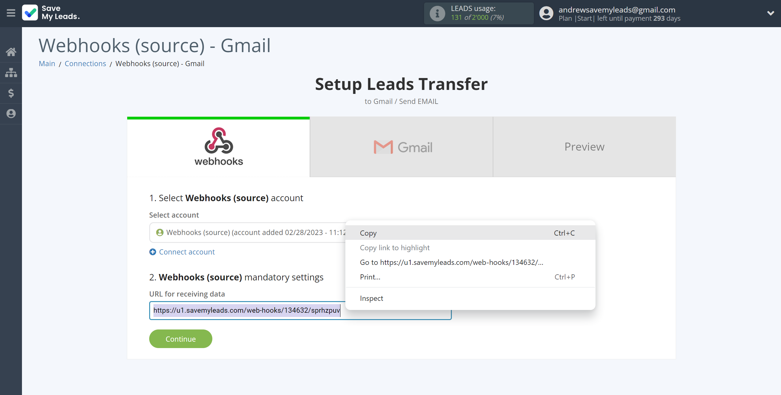 Next, you need to copy the "URL for receiving data", click "Continue" and go to your account, that supports data transfer via Webhooks.