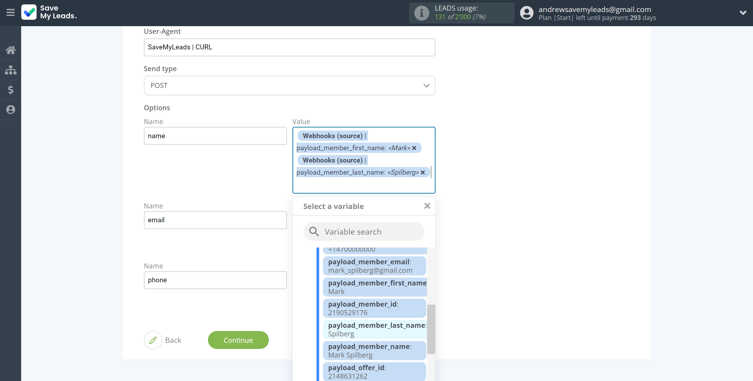 Please note that you can use not only Webhook variables, but also manually entered data, for example, you can write a profitable offer for customers in the body of the email. Also, all these data can be combined with each other. Just add the text you need in the required field or insert another parameter.
