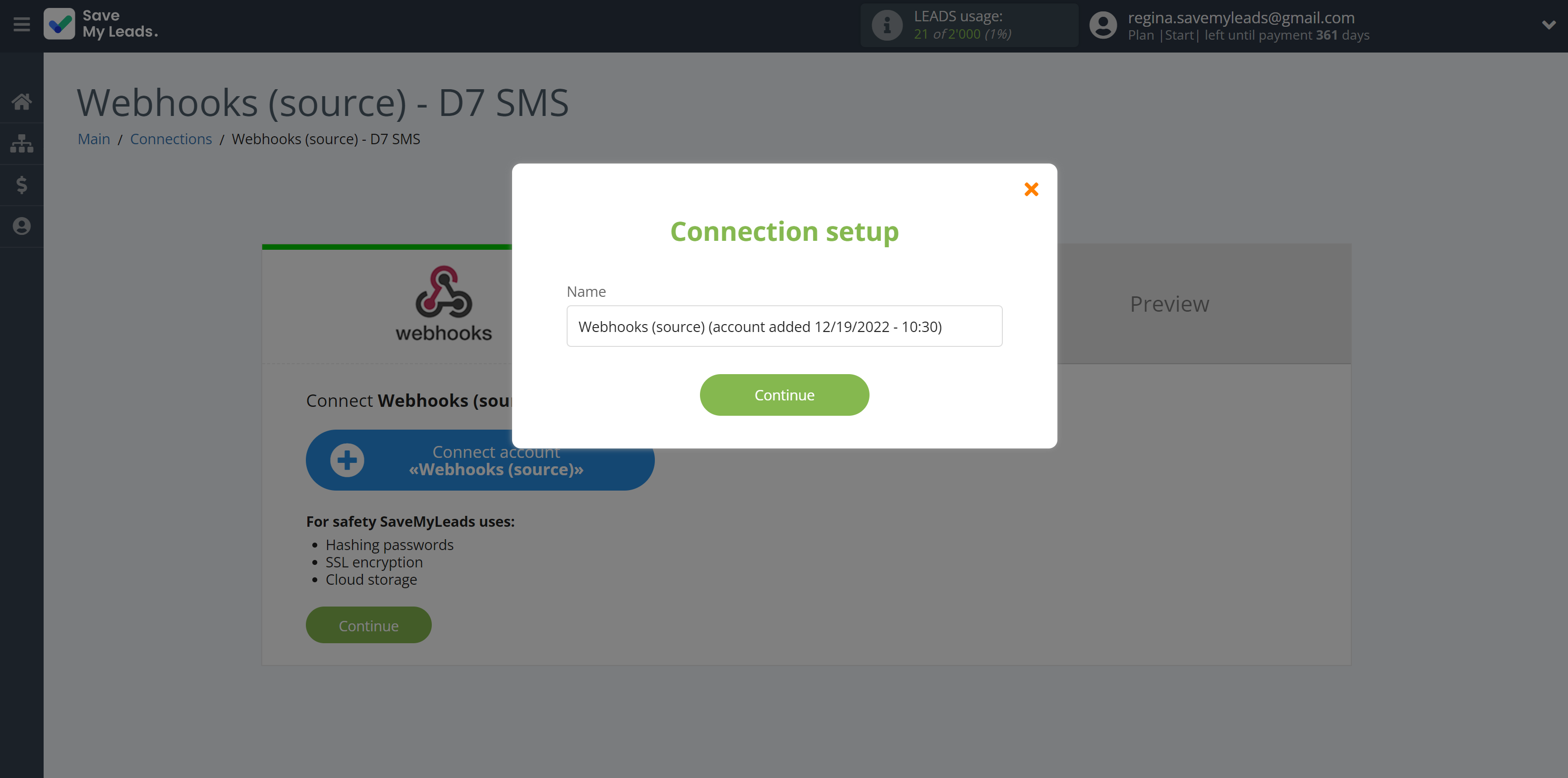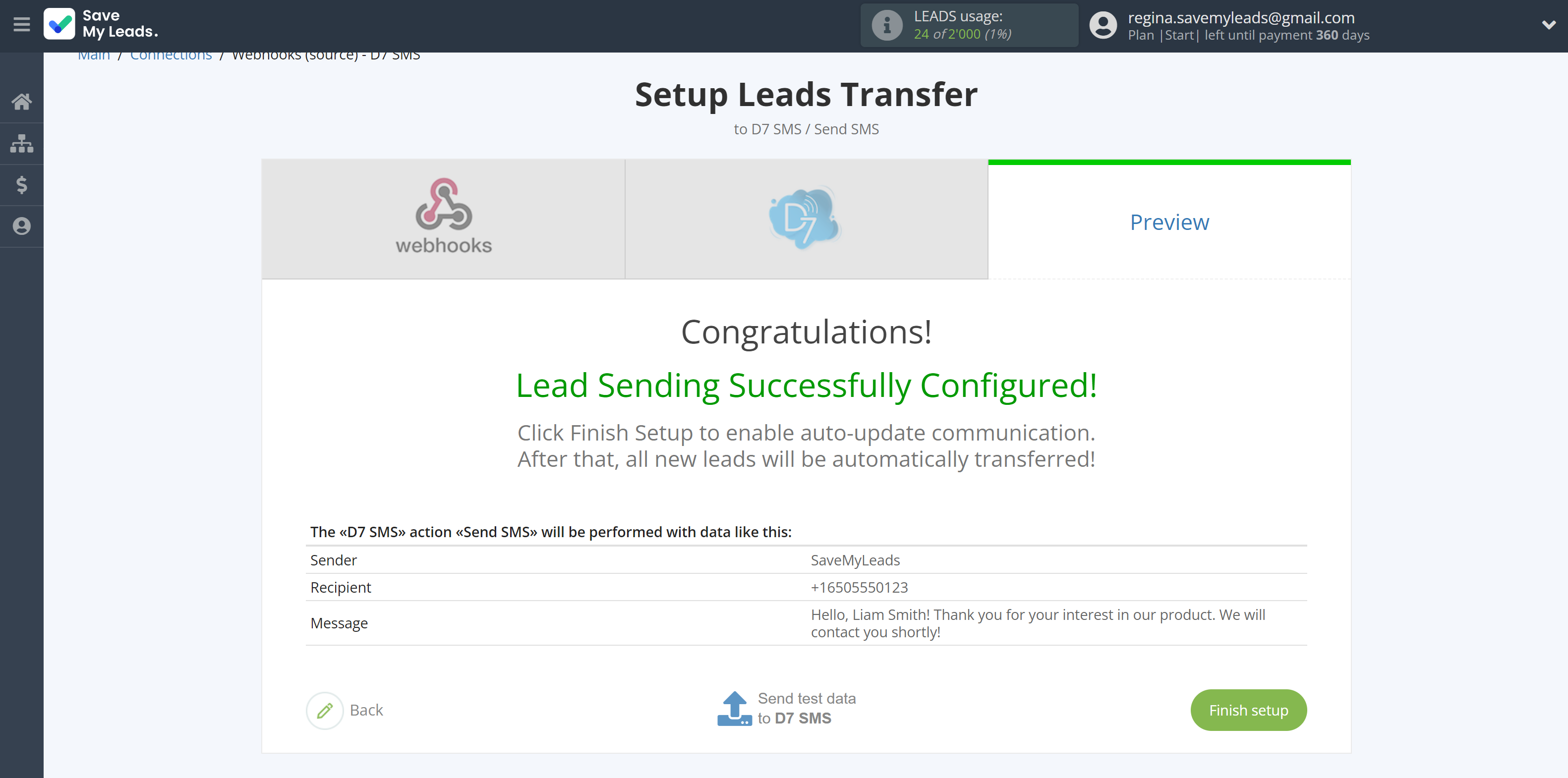 In order for data from Webhooks to be transferred multi-venously to D7 SMS, click "Finish setup".
