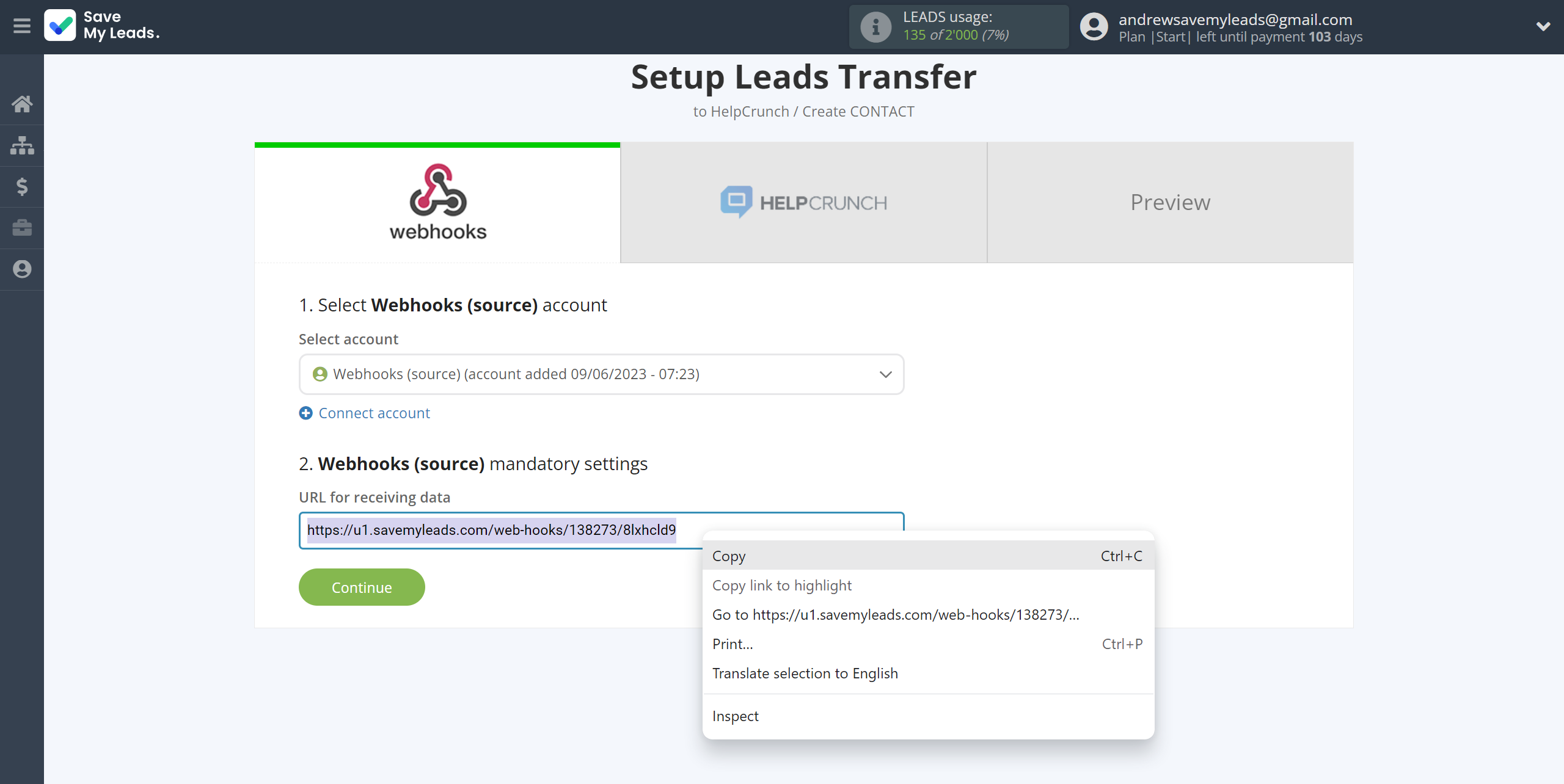 Next, you need to copy the "URL for receiving data", click "Continue" and go to your account, that supports data transfer via Webhooks.