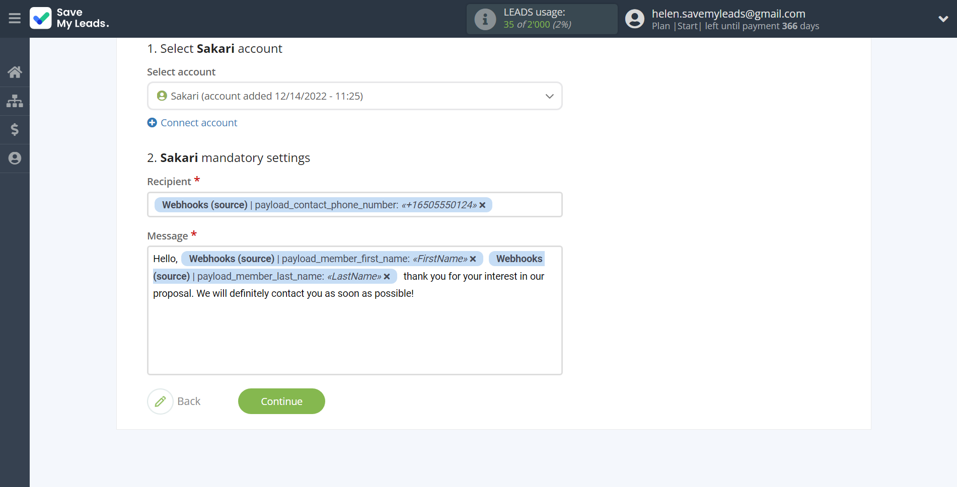 Select the required Webhooks data, click on the parameter and it will be assigned to the selected Sakari field.